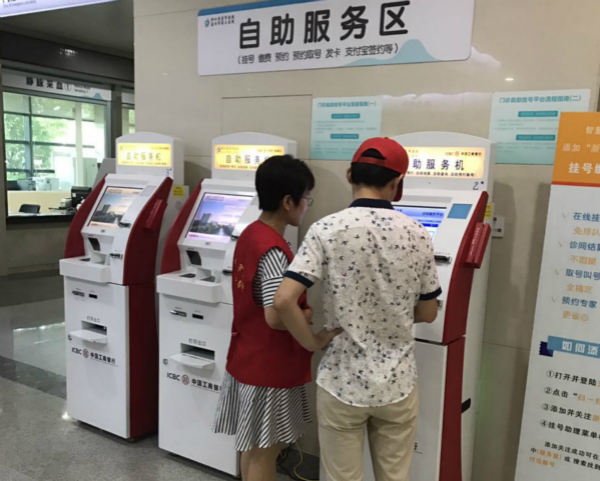 在門診人流量高峰期,醫(yī)院行政一支部的黨員志愿者們穿著統(tǒng)一的志愿者服裝,在咨詢臺(tái)幫助病人填寫掛號(hào)信息單,指導(dǎo)患者自助查詢、自助取藥、自助打印化驗(yàn)單,攙扶老人,為行動(dòng)不便的患者提供幫助,引導(dǎo)就診患者到相應(yīng)輔助科室進(jìn)行檢查,指引需住院患者到住院處辦理住院手續(xù)等志愿服務(wù)活動(dòng)。