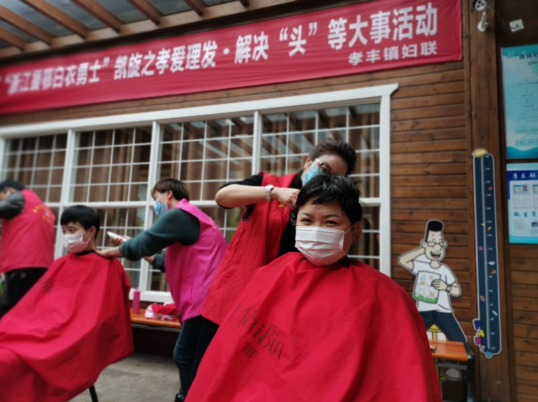 3月27日,從武漢抗疫一線返回浙江快一周的浙江省榮軍醫(yī)院援鄂醫(yī)療隊(duì)隊(duì)員王雅琴、蔣鳳美等人接受了安吉當(dāng)?shù)貗D聯(lián)提供的理發(fā)服務(wù)。