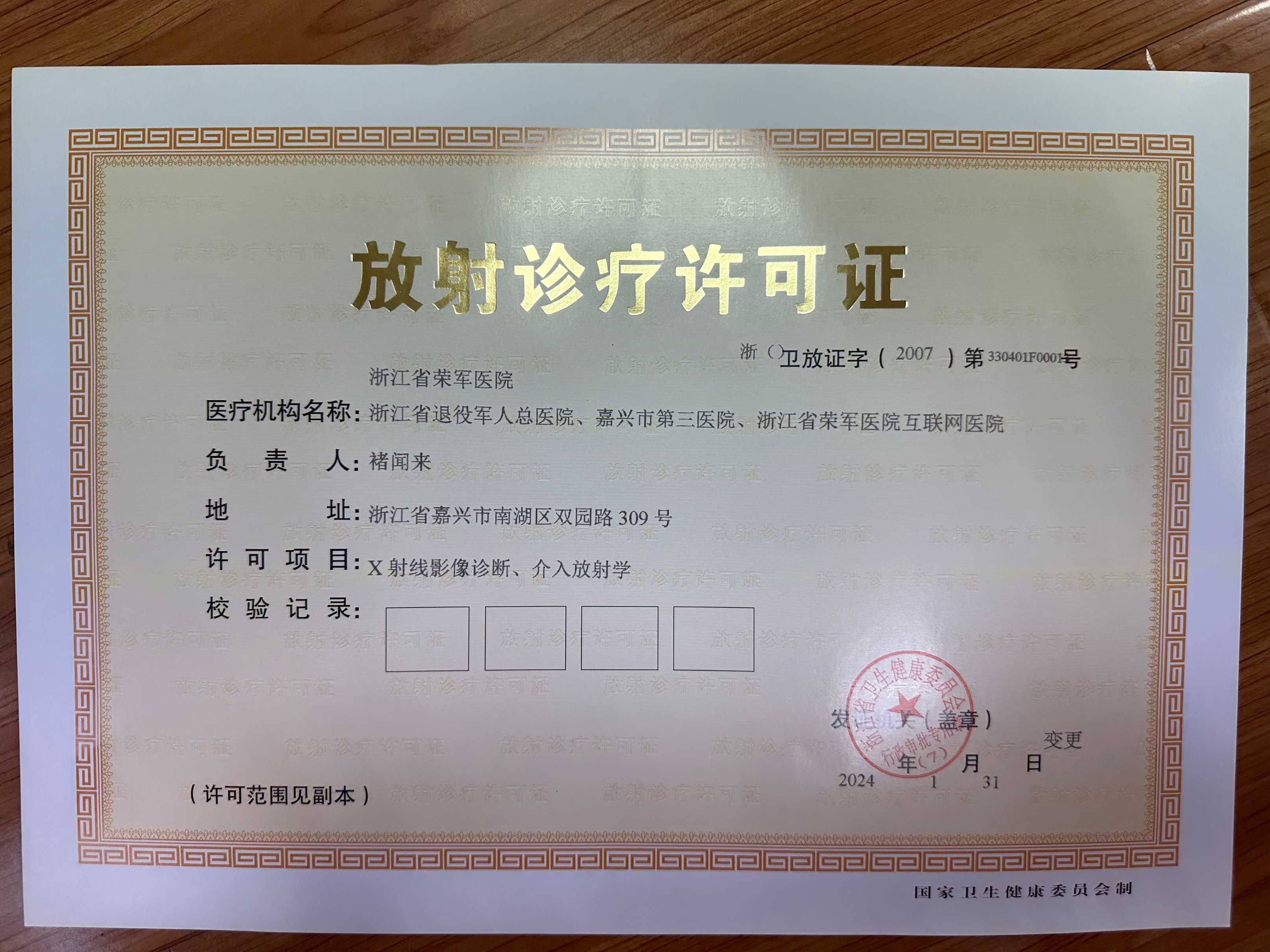 浙江省榮軍醫(yī)院放射診療許可證書