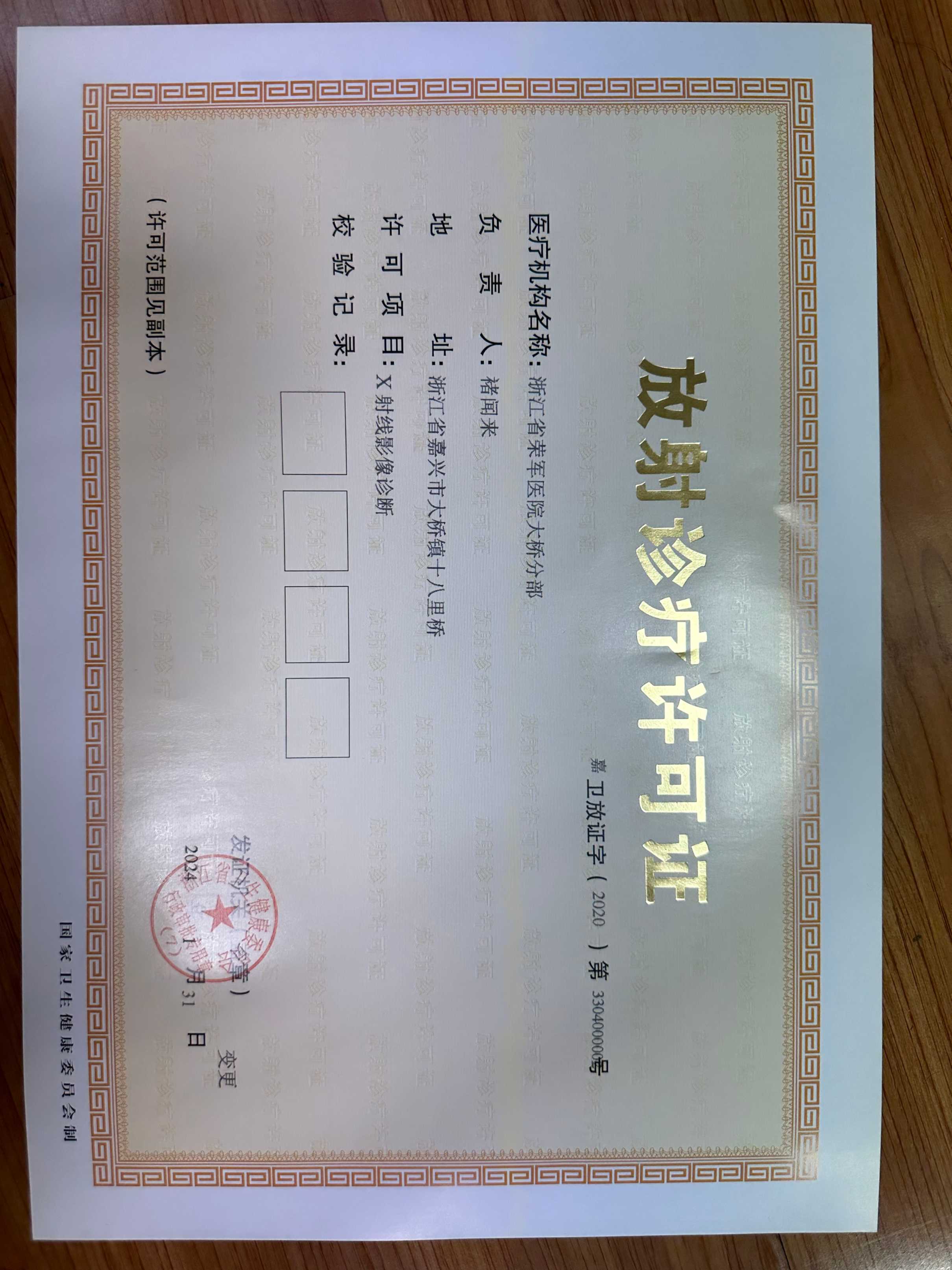 浙江省榮軍醫(yī)院大橋分部放射診療許可證書
